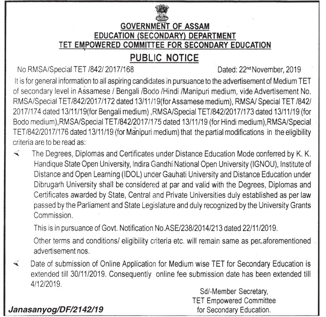 Also, Date of submission of Online Application for Medium wise TET for Secondary Education is extended till 30/11/2019. Consequently online fee submission date has been extended till 4/12/2019.