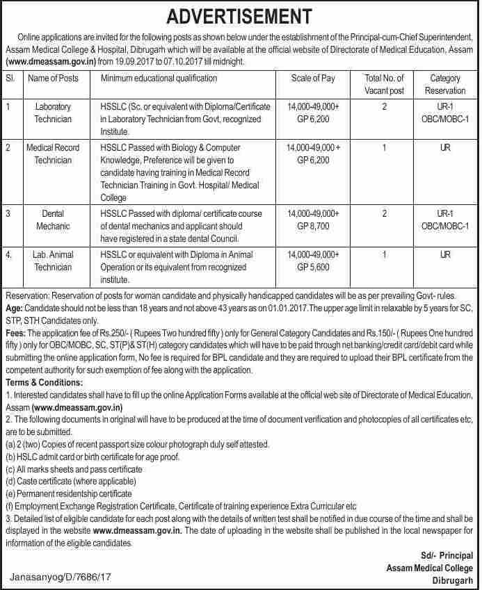 How to apply: Interested candidates shall have to fill up the online Application Forms available at the official web site of Directorate of Medical Education, Assam (www.dmeassam.gov.in)