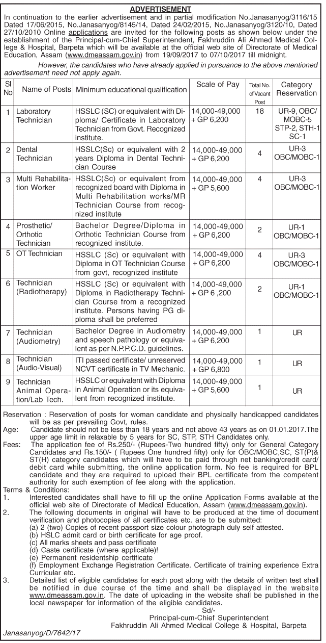 Online applications are invited for the following posts as shown below under the establishment of the Principal-cum-Chief SuperintendentFakhruddin Ali Ahmed Medical College & Hospital, Barpeta which will be available at the official web site of Directorate of Medical Education, Assam from 19.09.2017 to 07.10.2017 till midnight.