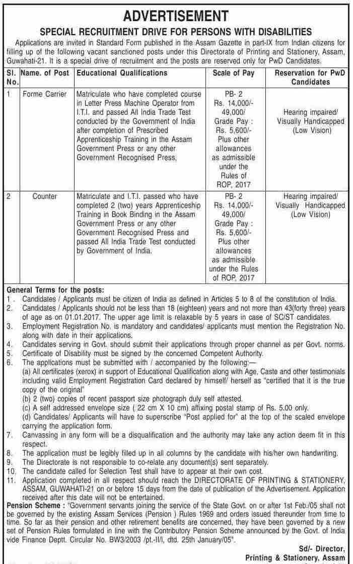 Application completed in all respect should reach the DIRECTORATE OF PRINTING & STATIONERY, ASSAM, GUWAHATI-21 on or before 15 days [from 8th September 2017] from the date of publication of the Advertisement. Application received after this date will not be entertained.